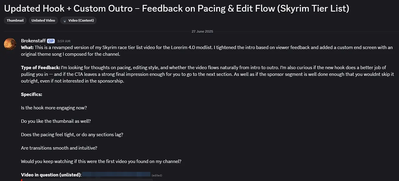 Let People Know You Listened If you post another piece of content, mention that you applied previous feedback (“I tried to fix the audio this time - let me know if it’s better!”). This shows you value the community’s input and encourages more people to help you in the future.